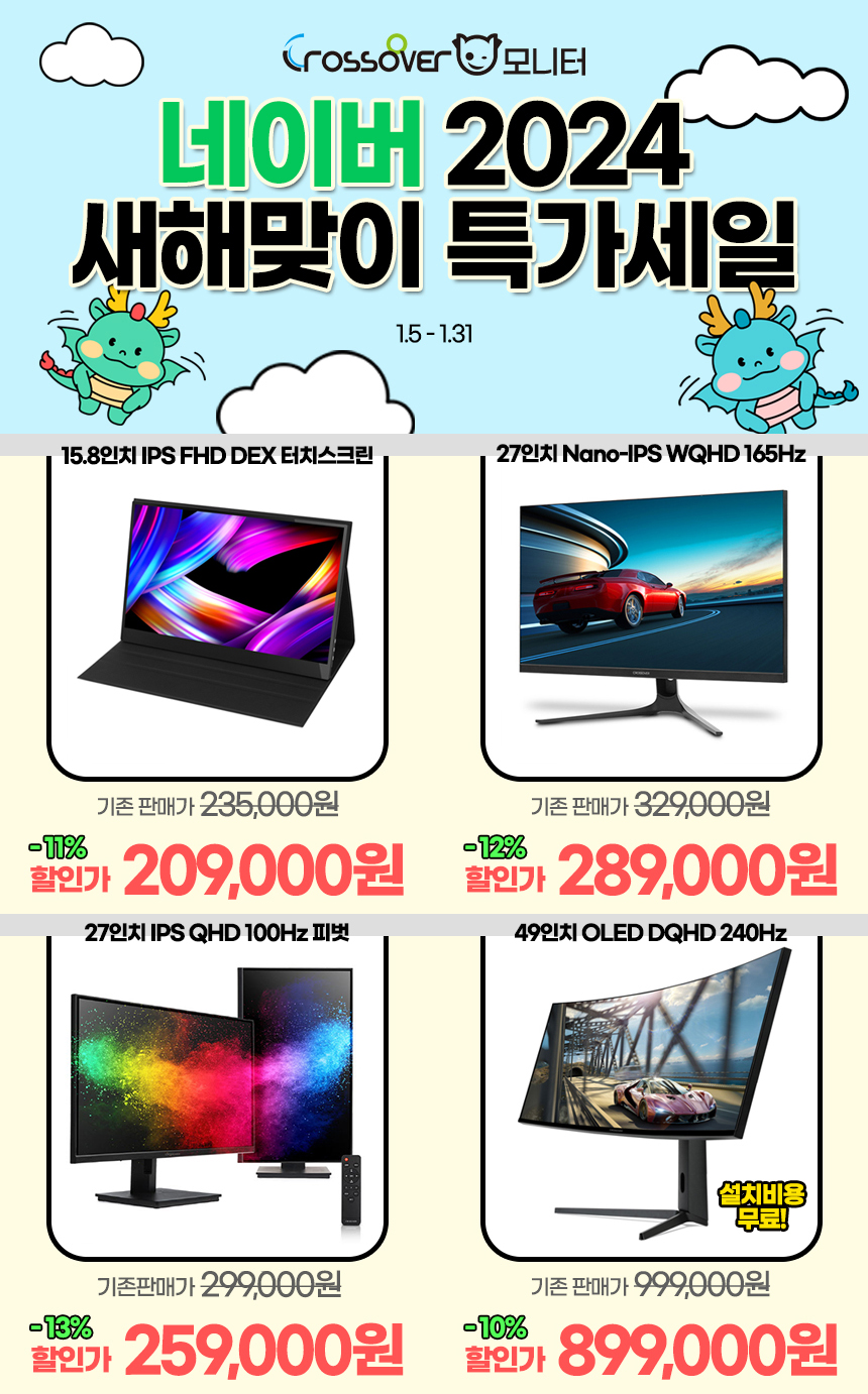 토털 디스플레이 브랜드 크로스오버 (주 크로스오버존, 대표 이영수, www.crosslcd.co.kr)는 자사의인기 게이밍 모니터 40종을 대상으로 네이버 스마트스토어 2024 새해 특가전을 실시한다고 밝혔다.