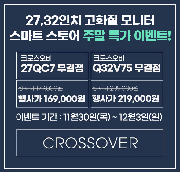 디스플레이 전문기업 ㈜크로스오버존(대표 이영수, www.crosslcd.co.kr)이 27형 고해상도 모니터 ‘27QC7 IPS 75 일타 QHD’와 32형 고해상도 모니터 ‘Q32V75 QHD IPS 75’를 대상으로 주말 특가 이벤트를 진행한다.