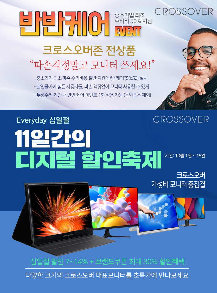 토털 디스플레이 브랜드 크로스오버(주 크로스오버존, 대표 이영수, www.crosslcd.co.kr)는 자사의 인기 게이밍 및 고해상도 모니터 55종을 대상으로 11번가 2023년 10월 에브리데이 십일절 이벤트를 진행한다고 밝혔다.