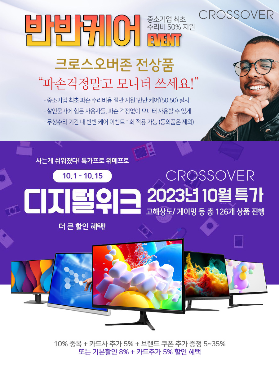 토털 디스플레이 브랜드 크로스오버 (주 크로스오버존, 대표 이영수, www.crosslcd.co.kr)는 자사의인기 게이밍 모니터 126종을 대상으로 위메프 2023년 10월 디지털위크 특가전을 실시한다고 밝혔다.