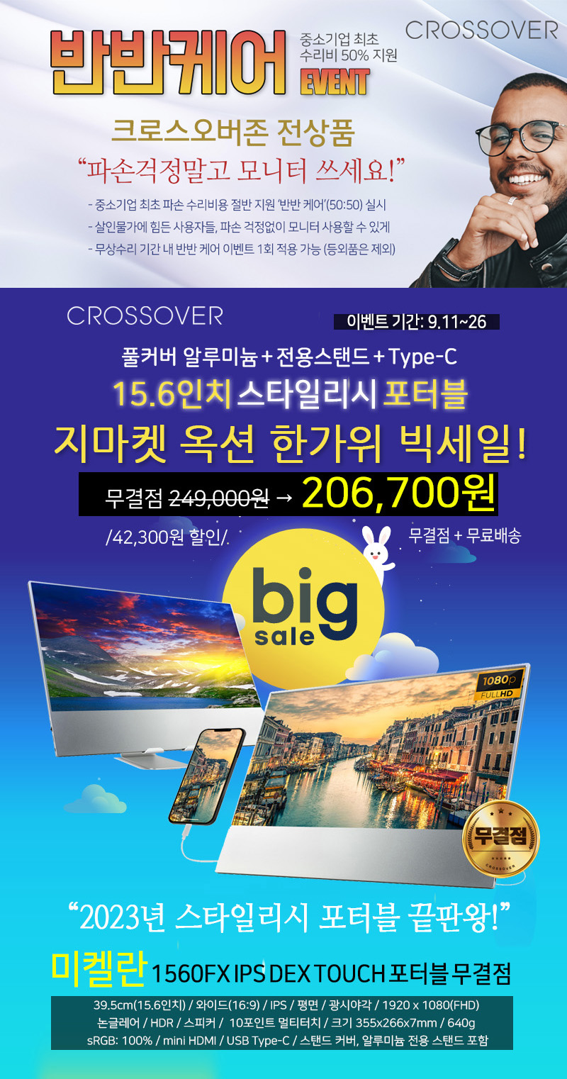 디스플레이 전문기업 ㈜크로스오버존(대표 이영수, www.crosslcd.co.kr)이 15.6형 화면을 가진 스타일리시 포터블 모니터 ‘미켈란 1560FX IPS DEX TOUCH 포터블’을 대상으로 옥션 지마켓 한가위 빅세일 특가전을 진행한다.