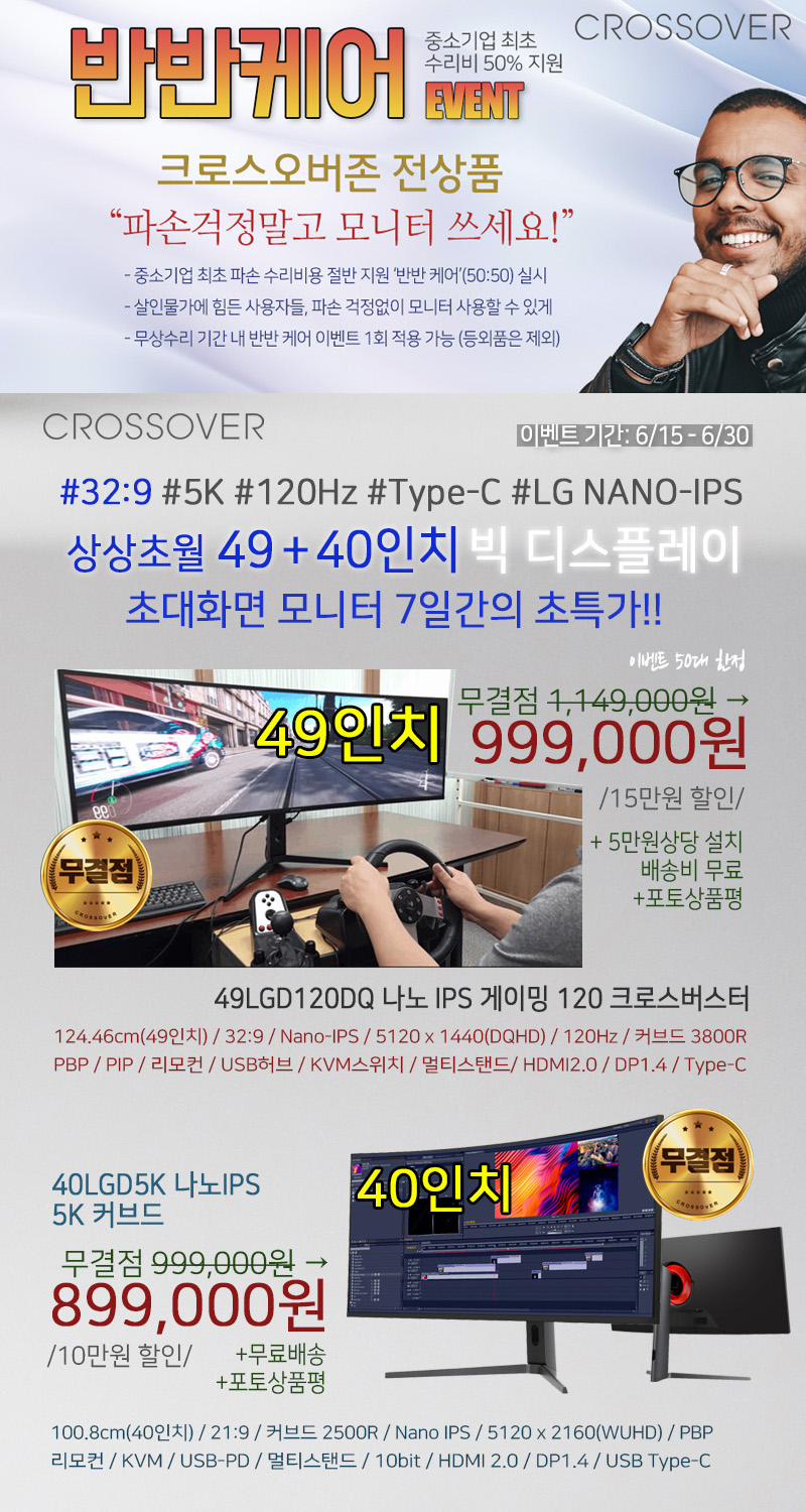 디스플레이 전문기업 ㈜크로스오버존(대표 이영수, www.crosslcd.co.kr)이 49형 32:9 모니터 ‘49LGD120DQ 나노 IPS 게이밍 120 크로스버스터’와 40형 5K 모니터 ‘40LGD5K 나노IPS 5K 커브드’를 대상으로 네이버 스마트스토어 빅 디스플레이 프로모션(BIG DISPLAY)을 진행한다고 밝혔다.