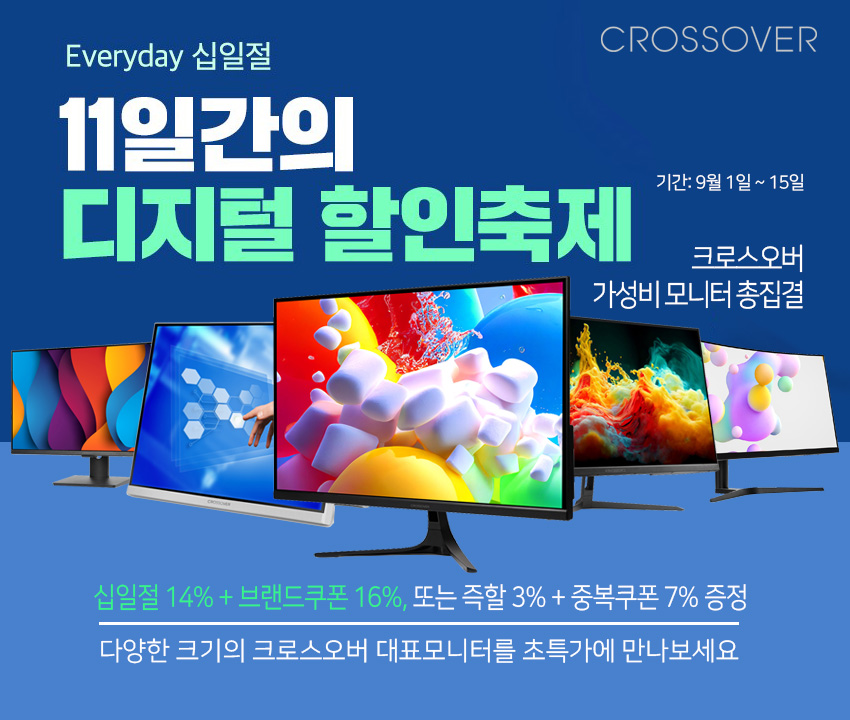 토털 디스플레이 브랜드 크로스오버(주 크로스오버존, 대표 이영수, www.crosslcd.co.kr)는 자사의 인기 게이밍 및 고해상도 모니터 107종을 대상으로 11번가 2023년 9월 에브리데이 십일절 이벤트를 진행한다고 밝혔다.