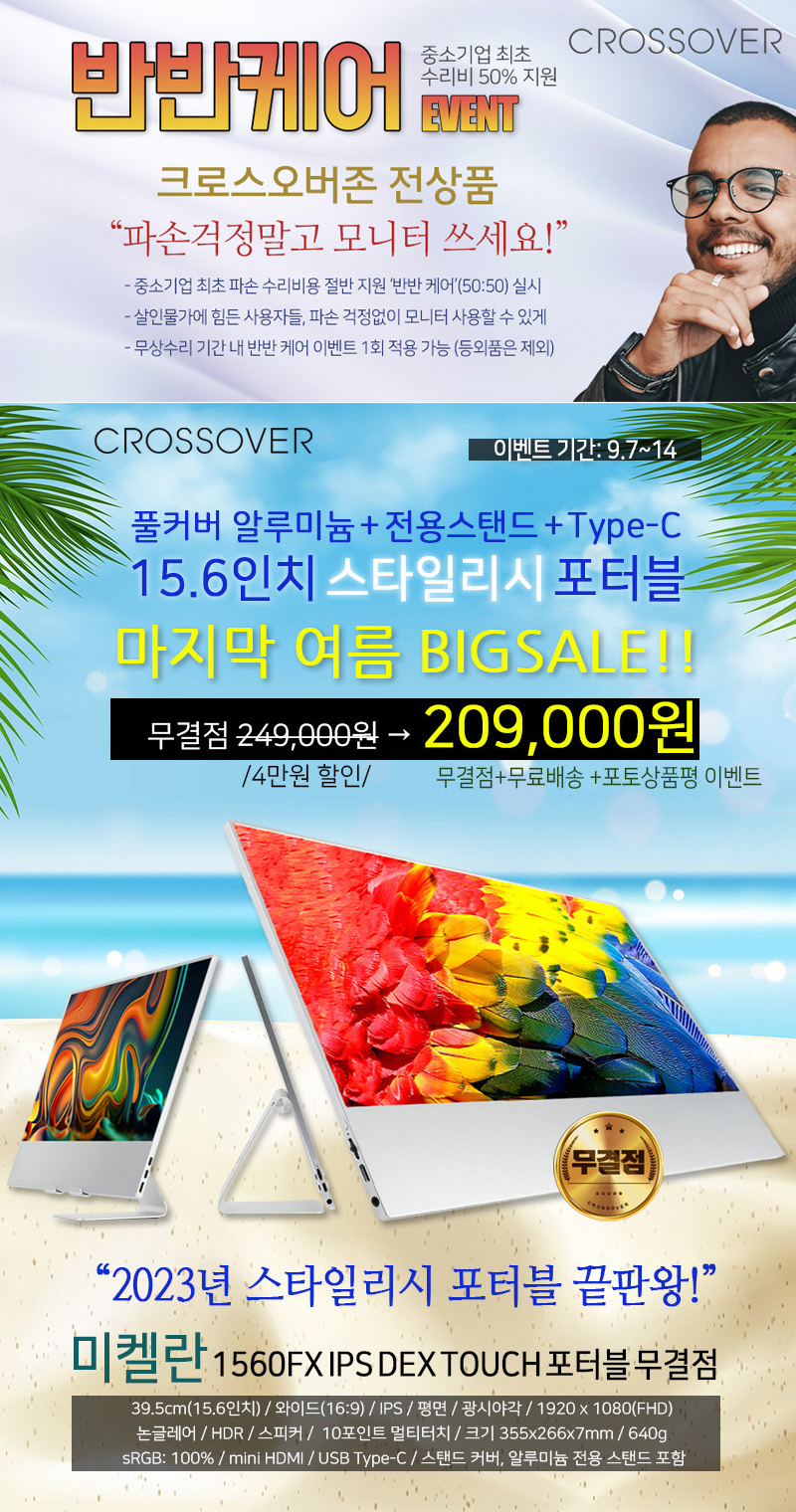 디스플레이 전문기업 ㈜크로스오버존(대표 이영수, www.crosslcd.co.kr)이 15.6형 화면을 가진 스타일리시 포터블 모니터 ‘미켈란 1560FX IPS DEX TOUCH 포터블’을 대상으로 마지막 여름 특가를 진행한다.