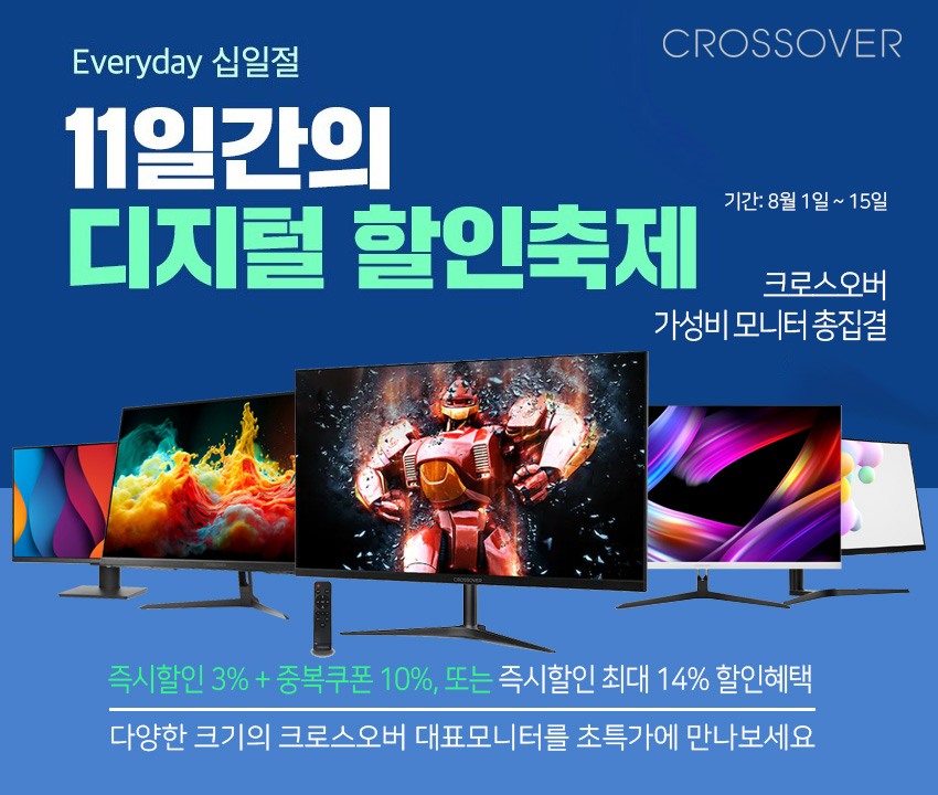 토털 디스플레이 브랜드 크로스오버(주 크로스오버존, 대표 이영수, www.crosslcd.co.kr)는 자사의 인기 게이밍 및 고해상도 모니터 92종을 대상으로 11번가 2023년 8월 에브리데이 십일절 이벤트를 진행한다고 밝혔다.