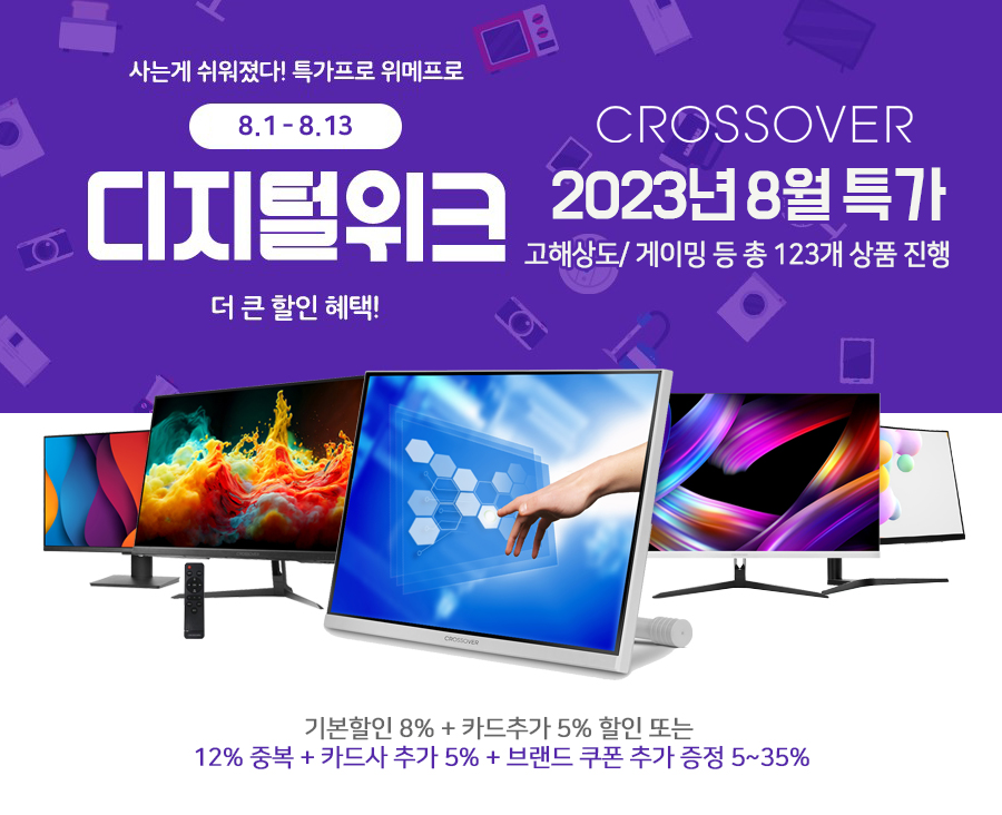 토털 디스플레이 브랜드 크로스오버 (주 크로스오버존, 대표 이영수, www.crosslcd.co.kr)는 자사의인기 게이밍 모니터 123종을 대상으로 위메프 2023년 8월 디지털위크 특가전을 실시한다고 밝혔다.