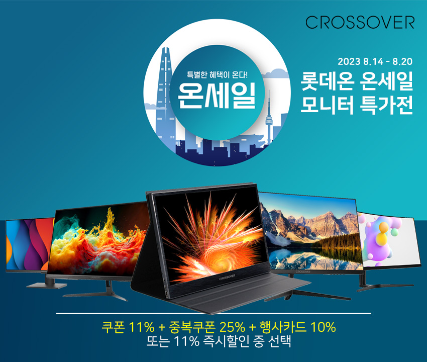 토털 디스플레이 브랜드 크로스오버 (주 크로스오버존, 대표 이영수, www.crosslcd.co.kr)는 자사의인기 모니터 127종을 대상으로 롯데온 2023년 8월 온세일 할인전을 진행한다고 밝혔다.