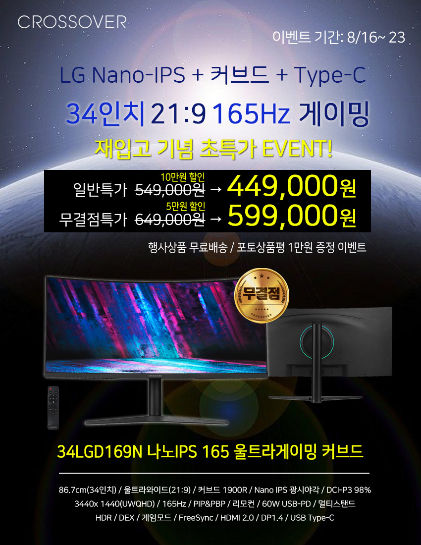 디스플레이 전문기업 ㈜크로스오버존(대표 이영수, www.crosslcd.co.kr)이 34형 나노IPS 커브드 게이밍 모니터 ‘34LGD169N 나노IPS 165 TYPE-C PD 울트라게이밍 커브드’ 재입고를 기념하기 위해 초특가 이벤트를 진행한다고 밝혔다.
