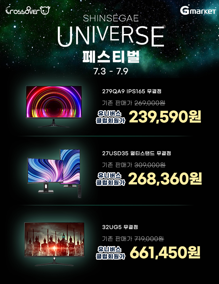 토털 디스플레이 브랜드 크로스오버 (주 크로스오버존, 대표 이영수, www.crosslcd.co.kr)는 자사의인기 포터블, 게이밍, 고해상도 모니터들을 대상으로 옥션 지마켓 7월 신세계 유니버스 페스티벌을 펼친다고 밝혔다.
