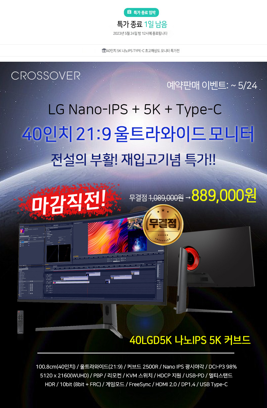 마감임박! D-1: 889,000원, 40인치 LG 21:9 5K 나노IPS 커브드 패널 적용 크로스오버 무결점 모니터 특가