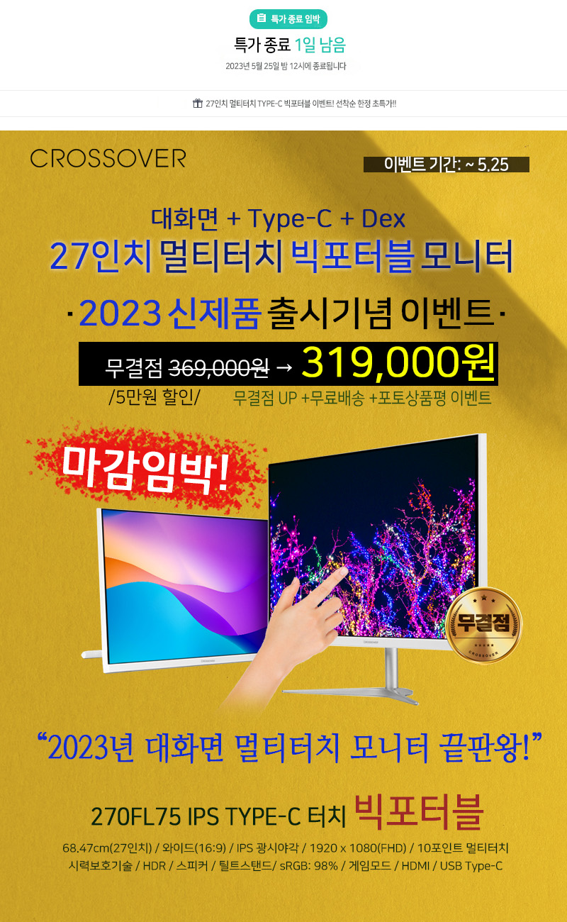 디스플레이 전문기업 ㈜크로스오버존(대표 이영수, www.crosslcd.co.kr)이 27형 대화면에 FHD 해상도를 적용한 모니터 ‘270FL75 IPS TYPE-C 터치 빅포터블’ 출시를 기념하기 위해 스마트스토어 특가전을 펼친다.