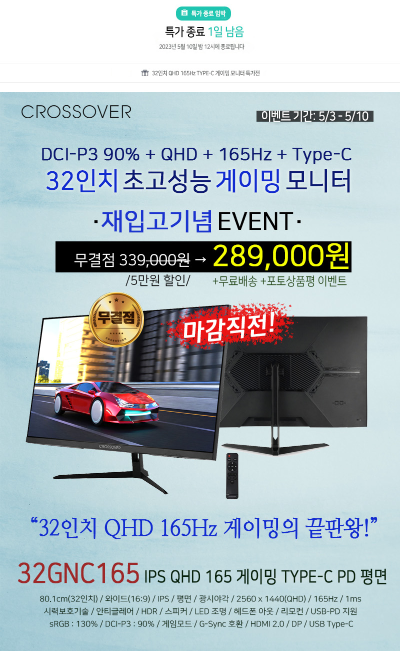 - D-1Day! 32인치 IPS 패널, QHD 고해상도, 165Hz 지원 32GNC165 재입고 기념 특가 종료 직전