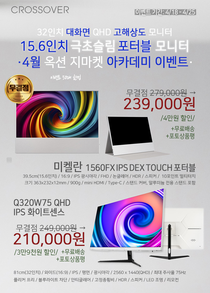 디스플레이 전문기업 ㈜크로스오버존(대표 이영수, www.crosslcd.co.kr)이 15.6형 슈퍼초슬림 포터블 모니터 ‘미켈란 1560FX IPS DEX TOUCH 포터블’과 32형 QHD 고해상도 모니터 ‘Q320W75 QHD IPS 화이트 센스’를 대상으로 옥션 지마켓 4월 아카데미 특가전을 진행한다.