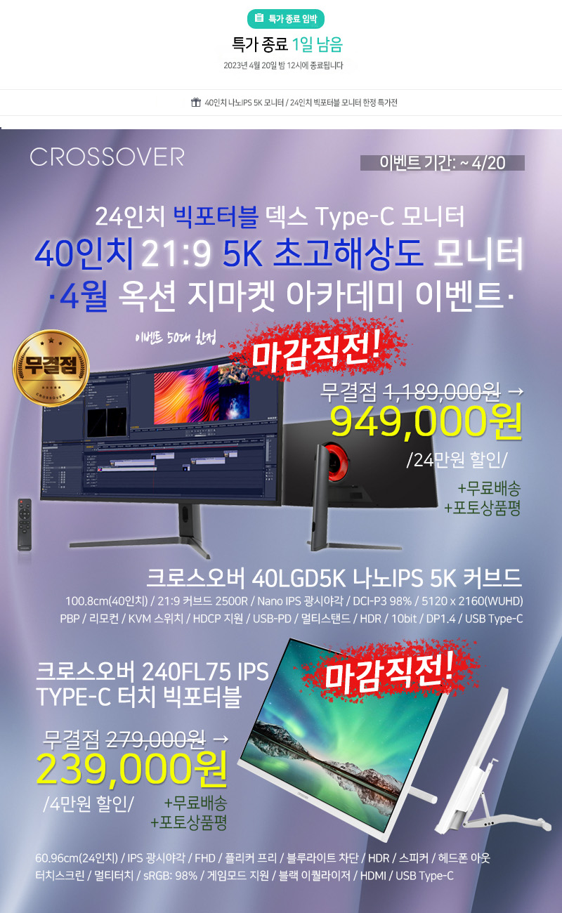 디스플레이 전문기업 ㈜크로스오버존(대표 이영수, www.crosslcd.co.kr)이 40형 5K 초고해상도 커브드 모니터 ‘40LGD5K 나노IPS 5K 커브드’와 24형 덱스지원 ‘240FL75 IPS TYPE-C 터치 빅포터블’을 대상으로 옥션 지마켓 4월 아카데미 특가전을 진행한다.