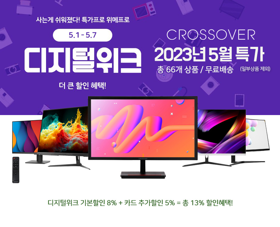토털 디스플레이 브랜드 크로스오버 (주 크로스오버존, 대표 이영수, www.crosslcd.co.kr)는 자사의인기 게이밍 모니터 66종을 대상으로 위메프 2023년 5월 디지털위크 특가전을 실시한다고 밝혔다.