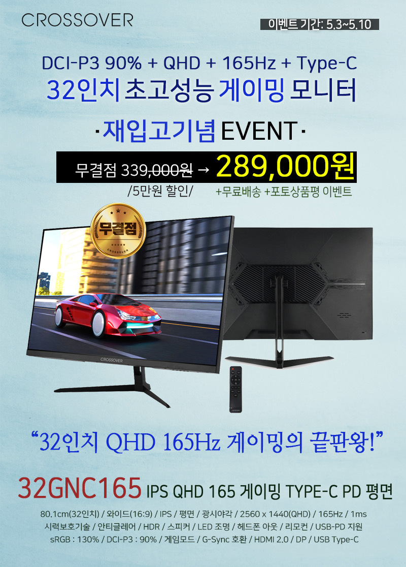 디스플레이 전문기업 ㈜크로스오버존(대표 이영수, www.crosslcd.co.kr)이 32형 QHD 165Hz를 지원하는 프로급 게이밍 모니터 ‘32GNC165 IPS QHD 165 게이밍 TYPE-C PD 평면’ 재입고를 기념하기 위해 특가전을 진행한다고 밝혔다.