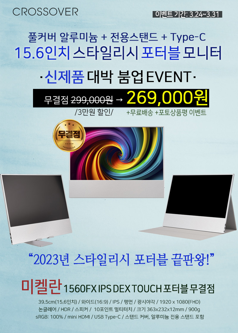 디스플레이 전문기업 ㈜크로스오버존(대표 이영수, www.crosslcd.co.kr)이 15.6형 화면을 가진 스타일리시 포터블 모니터 ‘미켈란 1560FX IPS DEX TOUCH 포터블’을 대상으로 대박 붐업 이벤트를 진행한다.