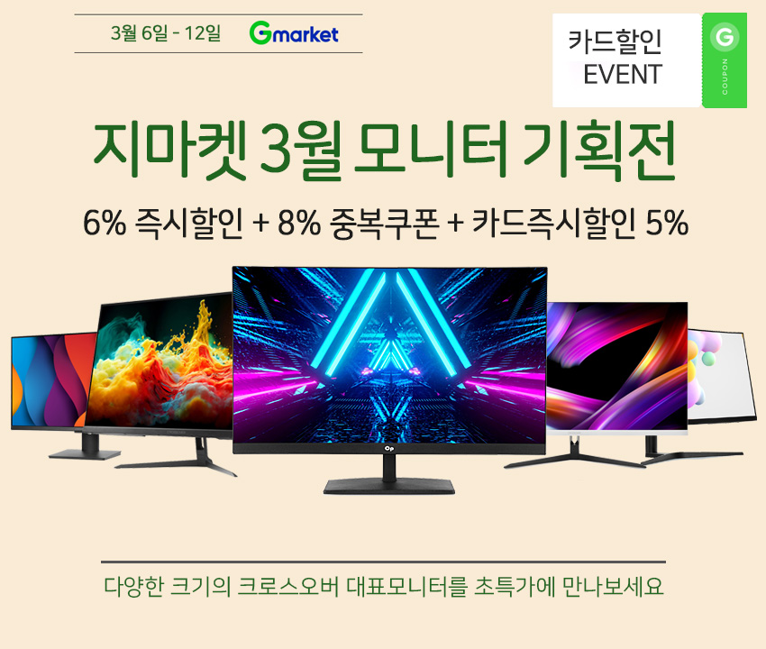"기본 할인에 카드할인을 더해서 높은 혜택으로 지마켓에서 크로스오버의 다양한 모니터들을 만나보세요”